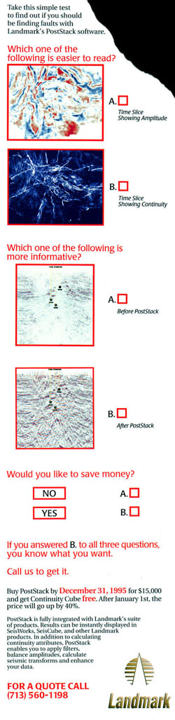 I had this one all to myself. I took their big pile of documentation and fly sheets outlining their new software package, PostStack (geoseismic research tool) and distilled it down into a catchy, attention getting mailer. The "torn" part (black space) was an existing die cut my chosen printer had available that I was able to utilize. The client gave no input beyond the stack of info, and made no changes other than text alignment before it went to press the next day. This item was chosen from hundreds of entrants to be nominated for a Business Marketing Association (BMA) Lantern award. I received an honorable mention. |